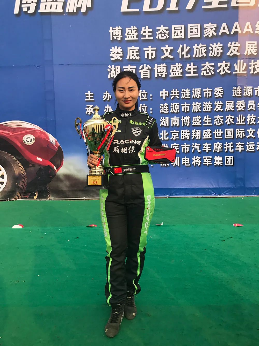 荣盼盼,J-RACING将相侯赛车服体验官,一个在中国越野赛车届响当当的名字,中国专业赛车运动首个 女子冠军,12年赛车生涯,她先后荣获冠军奖杯108座,亚、季军奖杯30座,取得年度总冠军2次,年度亚军1次。