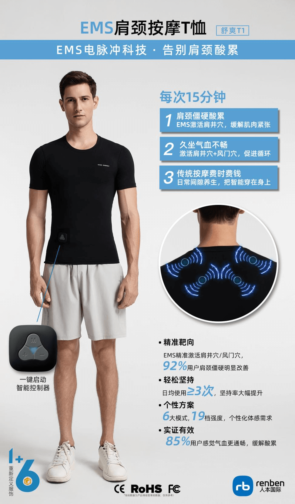 第一时间看功能精准度。EMS按摩T恤的核心是“靶向缓解”,需关注其作用区域是否匹配自身痛点:若常被肩颈僵硬、肌肉紧张困扰,优先选聚焦肩井穴、风门穴等肩颈关键部位的款式;若追求全身放松,则需看是否覆盖更多肌群。需警惕“泛泛按摩”的产品——精准作用于劳损部位,才能高效缓解不适。