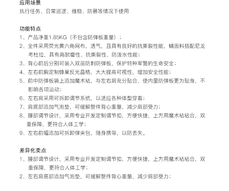 -可更换防弹板 -可拆卸弹夹包 -气泡垫肩,缓解肩部受力 -肩部、腹部、腰部可调节系统